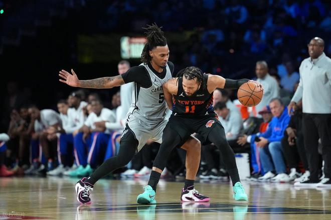比赛回归:首节比赛便火花四溅。尼克斯这边明确主攻方向,布伦森与阿奴诺比扛起进攻大旗,两人合力砍下 19 分,包揽球队首节 28 分中的绝大部分;马刺则延续多点开花的风格,首节 9 人轮换中有 7 人斩获得分,在胶着的拉锯战中以 2 分优势领先结束首节。次节战局依旧胶着,马刺虽未能拉开分差,但始终稳稳掌控领先优势。尼克斯进攻端依旧依赖布伦森与阿奴诺比的双核驱动,全力追分;马刺则持续多点发力,共有6人得分上 6,带着 2 分领先优势进入下半场。
